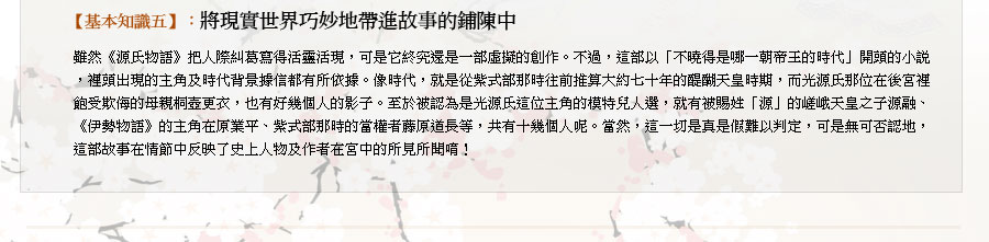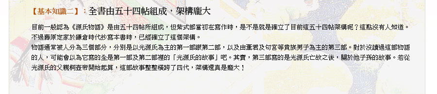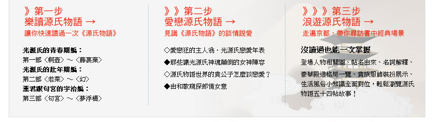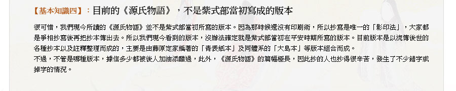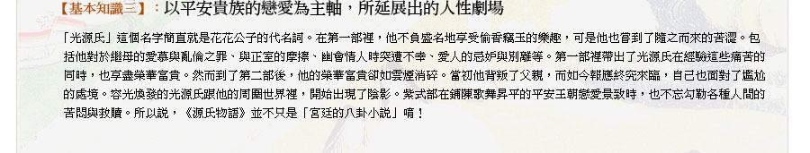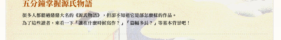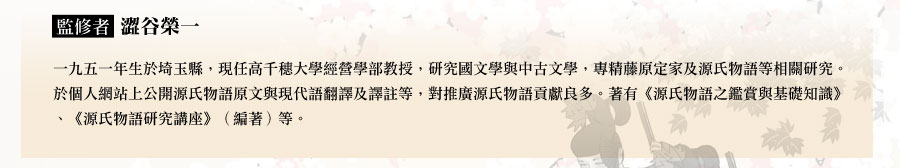 不過,即使是日本人,閱讀《源氏物語》都不是件容易的事,除了要面對文謅謅的古典文體,書中眾多登場的人物,以及平安時代特有的生活習俗、社會制度,都增加了閱讀上的難度。歷年來,已有不少作家致力編寫白話譯本,目的就是希望為這部千年前的作品爭取更多現代的讀者,至於高千穗大學澀谷榮一教授所主編的這本《源氏物語樂讀本》,無疑更拉近了《源氏物語》和讀者之間的距離。