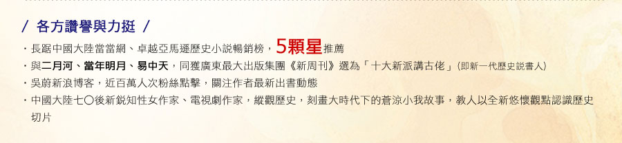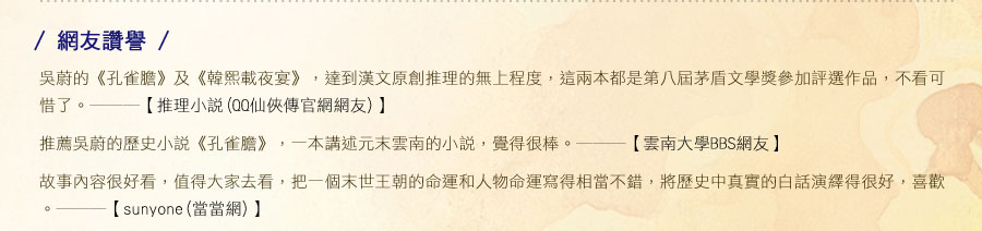 最後要特別說明的是,小說中有不少細節取自《葉榆稗史》《三迤隨筆》《淮城夜話》三部地方誌古籍。《葉榆稗史》的作者張繼白與段功的女兒段僧奴,是往來多年的至交好友;《三迤隨筆》的作者李浩與張繼白是姻親,且入明朝後接管所有大理藏書;《淮城夜話》的作者李以恆則是李浩的五世孫。這三位所寫的筆記可說是記錄大理歷史文化的第一手資料,彌足珍貴;在此特別向捐獻出這三部古籍手抄稿的李?先生(李浩的後人)表示深深的敬意,若非他的慷慨義舉,這三部書至今尚不為世人所知——斯人雖逝,俠名永留。